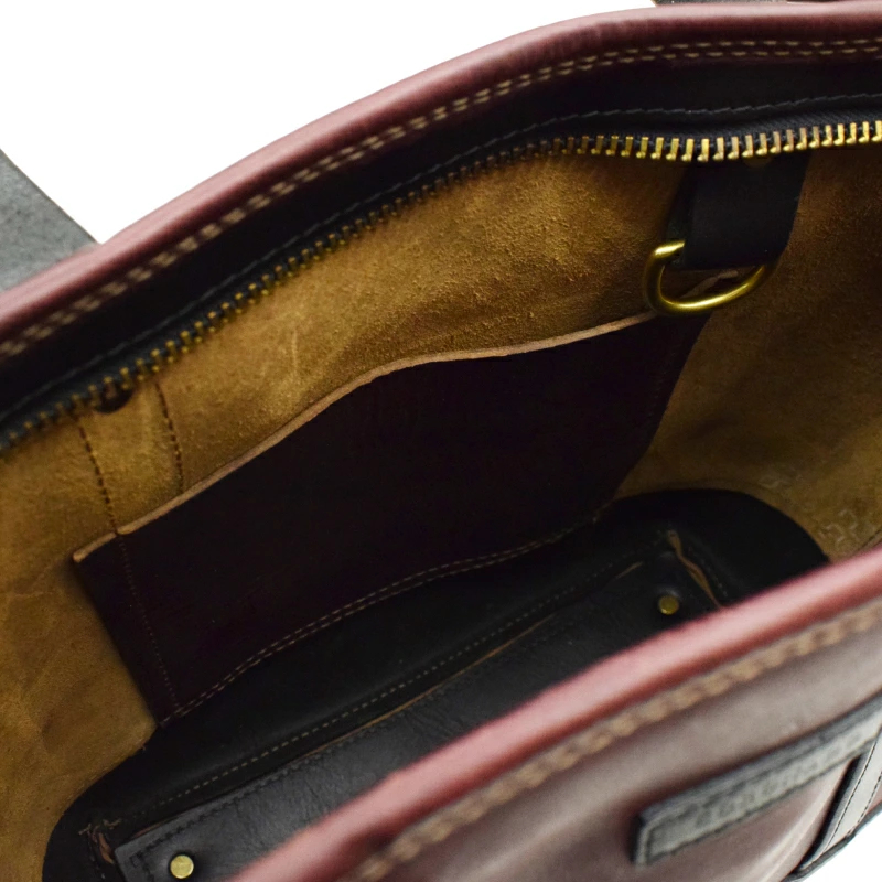 ハンドルにも肉厚のクロムエクセルレザーを使用し、金具と太糸でがっちりとボディに装着。