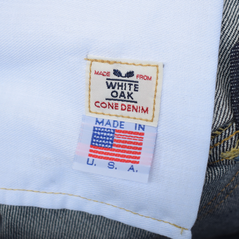 生地にはホワイトオーク工場製の2ndグレードにあたるコーンデニムを使用しており、ところどころに織りむらや傷の入る粗野な顔付が特徴的。