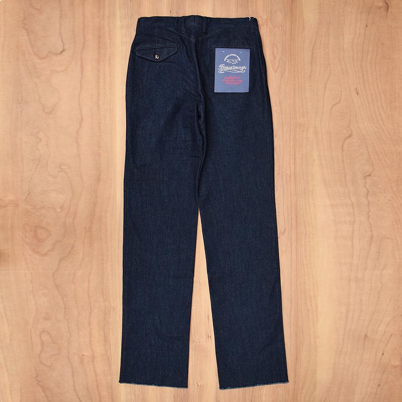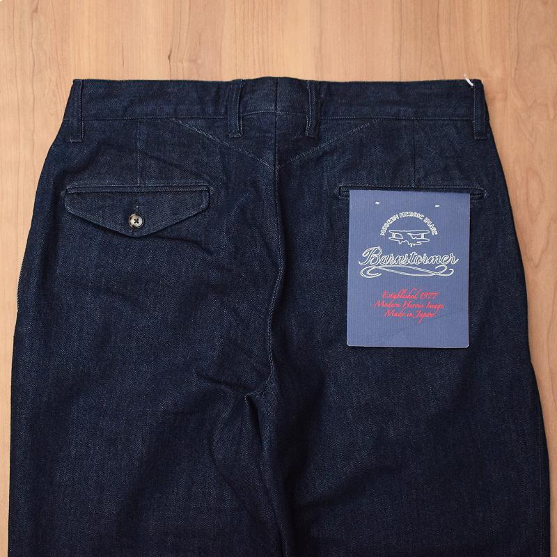 テーパードをかけず、腿周りからズトンと落としたワイドなストレートシルエットに、インタックの2プリーツとウォッチポケット。加えて、股下のマチにバックのヨークと、BARNSTORMERの持ち味である、こだわりのディテールも。